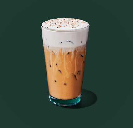Iced Pumpkin Chai: A rich and creamy Iced Chai––our blend of black tea infused with cinnamon, other warming spices and milk, topped with a sweet pumpkin cream cold foam and a dusting of pumpkin spice topping.
